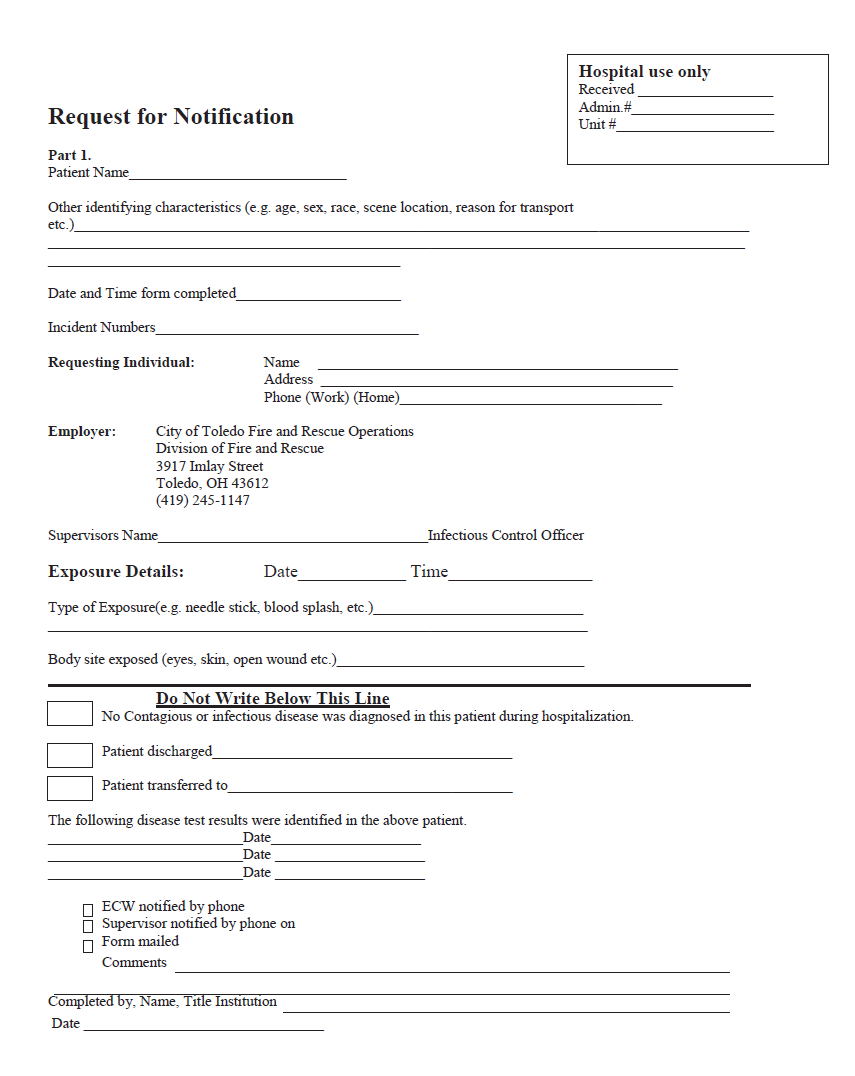 - 3. A “Request for Notification form” (attachment #2) shall be filled out by the Infection Control Officer or the Safety Officer or member in charge. The report will include details of the task being performed, the means of transmission, the portal of entry, and the type of PPE in use at the time. It is important to get the form to the hospital of the source patient promptly to insure proper testing of the source patient. It also will insure that if Post Exposure Prophylaxis (PEP) is indicated for the member involved, the time frame for administering the medications will be met.